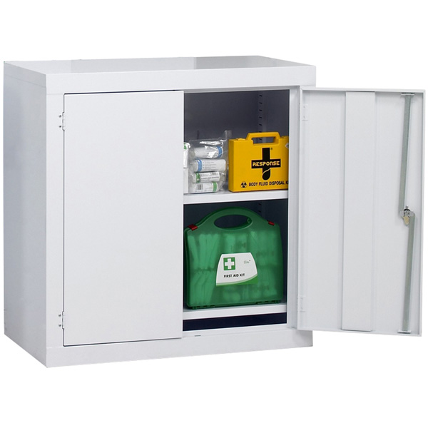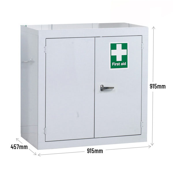 Storage cabinet for First Aid supplies and equipment. Manufactured using strong 20swg steel.
