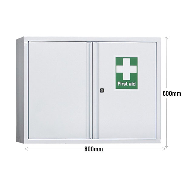 Storage cabinet for First Aid supplies and equipment. Manufactured using strong 20swg steel.