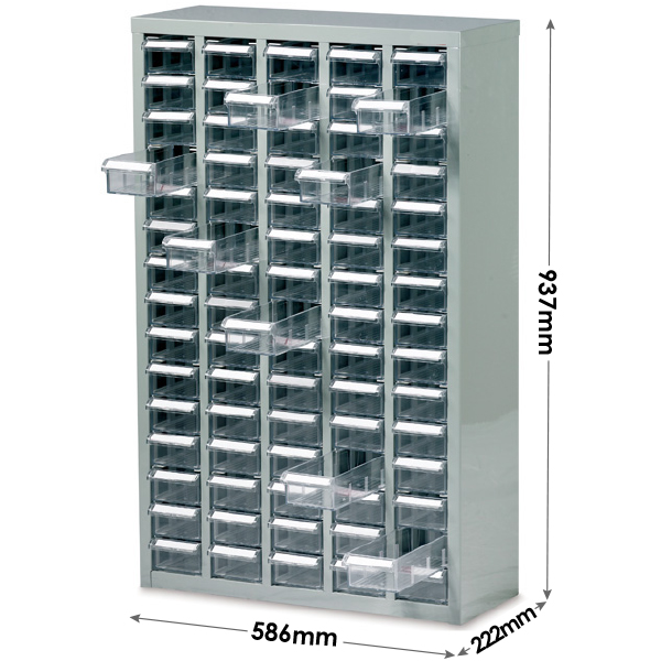 This small parts box cabinet comes complete with 75 transparent drawers and 75 dividers. The drawers are designed for easier product selection and easier visibility of stored items.