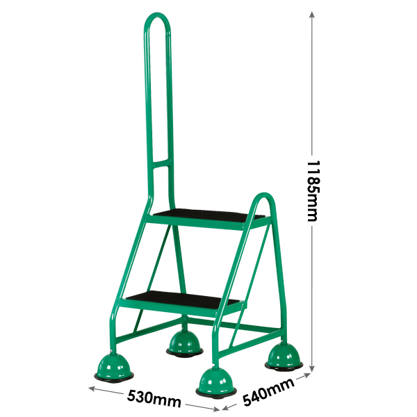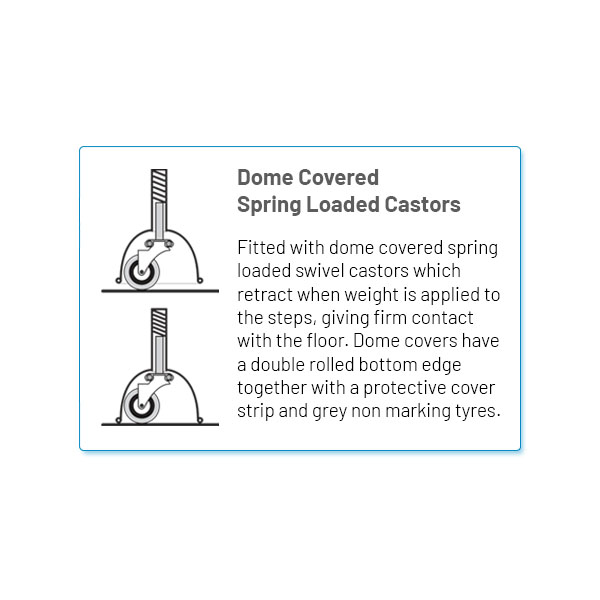 Mobile 2-step units with dome covered spring loaded castors with grey non-marking tyres. Castors retract when weight is applied to the steps, giving firm contact with the floor.