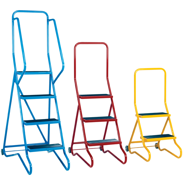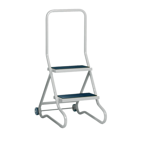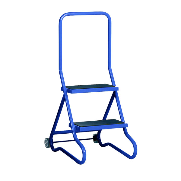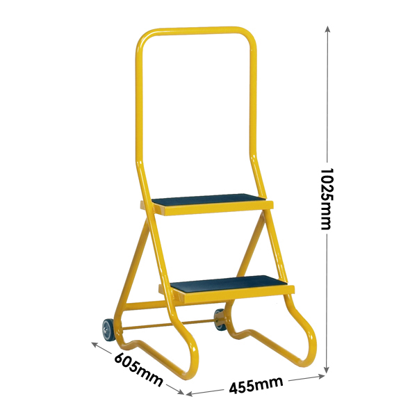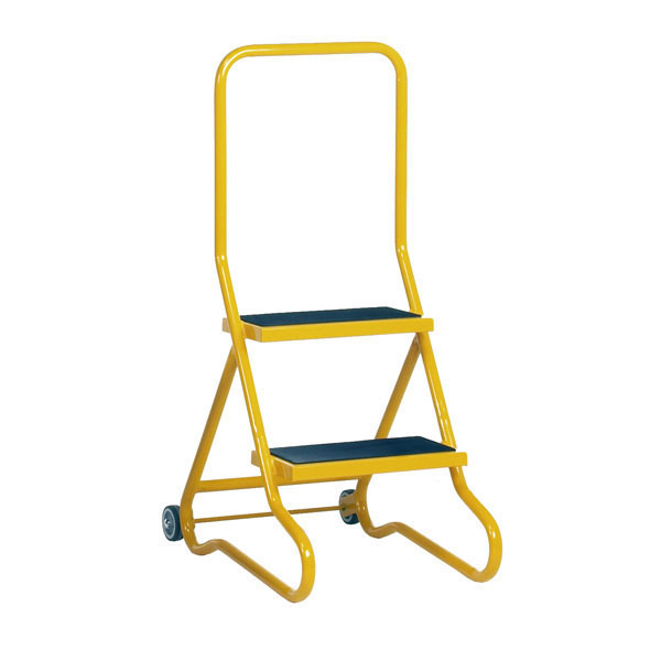 2 tread steps with wheels mounted on the rear of the frame to enable easy movement around the workplace.