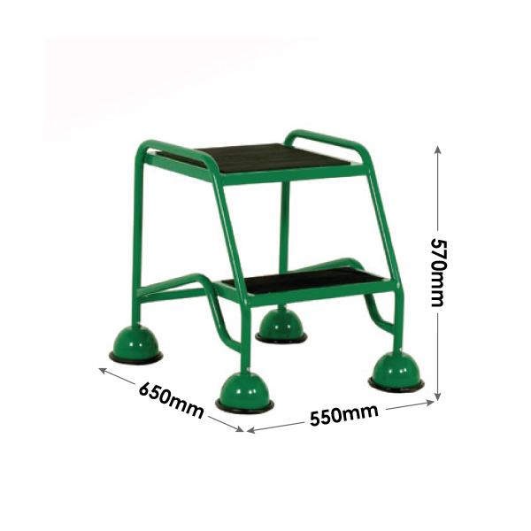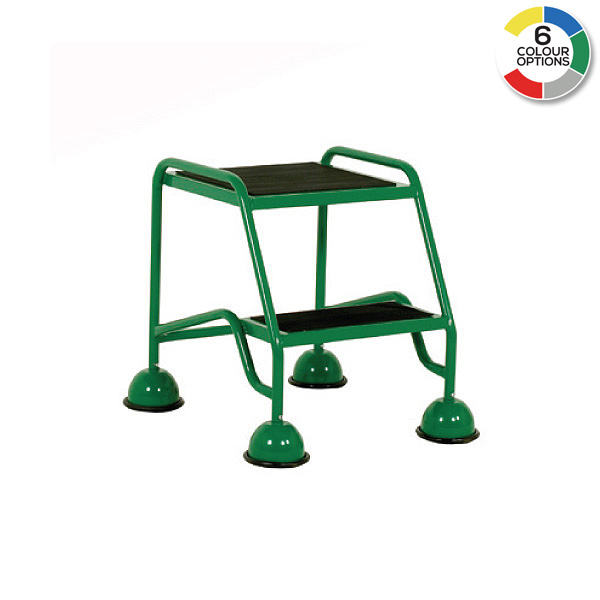 Mobile 2-step unit with large 400 x 380mm platform. Fitted with dome covered spring loaded castors which retract when weight is applied to the steps, giving firm contact with the floor.